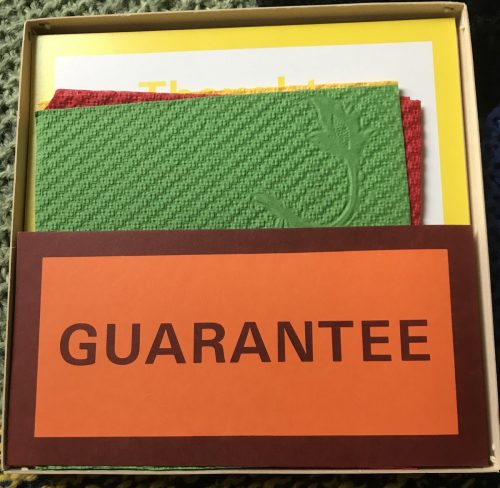 Includes several inserts: five printed cardboard sheets, one guarantee/info card, three paper handkerchieves.